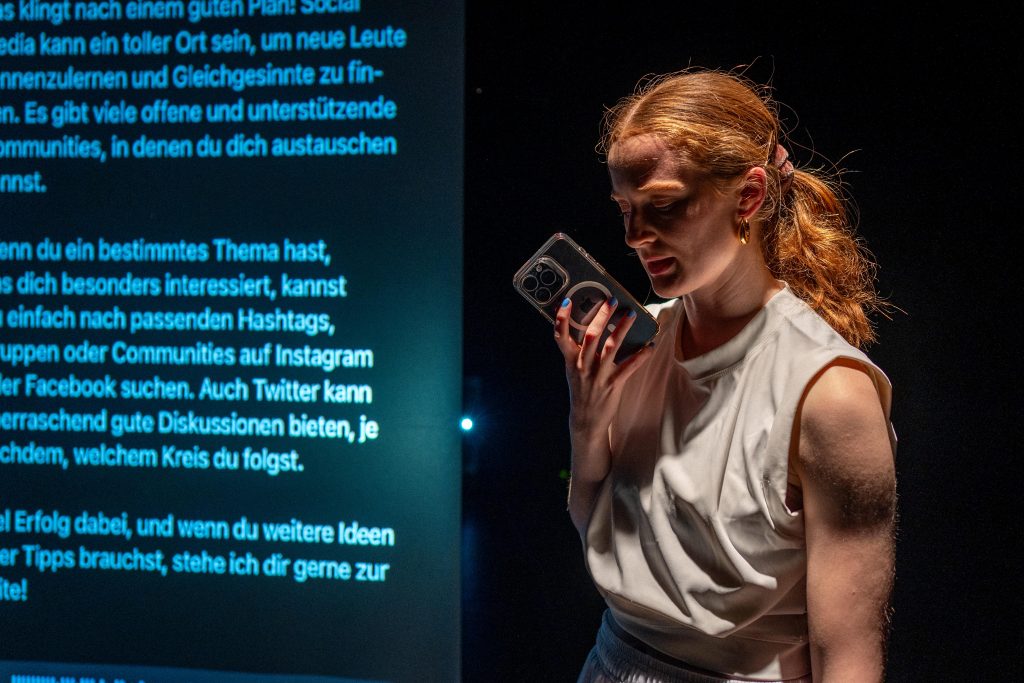 »Mein Körper in seinem Zimmer und ich – wir sind gut vernetzt. Eigentlich ist doch alles ok, denke ich. Aber ich fühle mich disconnected …« In dieser szenischen Versuchsanordnung tritt eine einsame Spielerin in Dialog mit einem digitalen Gegenüber und taucht dabei immer tiefer in ein Rabbit Hole aus virtueller Nähe und realer Distanz. Die Produktion öffnet eine Bühne für das Ringen um echte Verbindungen im digitalen Zeitalter.