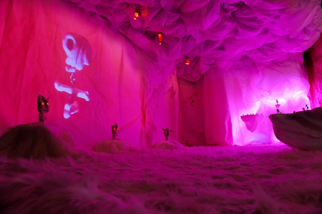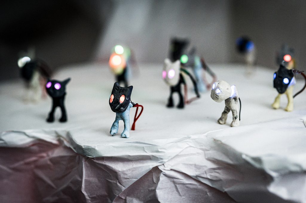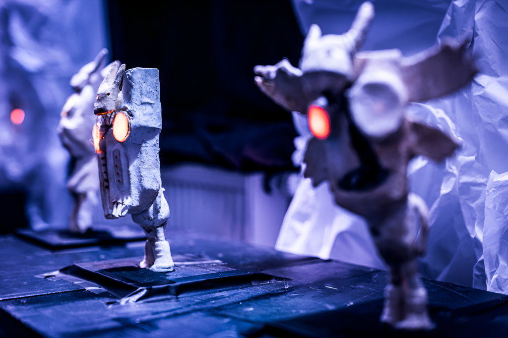 Die interdisziplinäre Künstlerin Karla Kracht beschäftigt sich in ihren Produktionen regelmäßig mit menschlichen Riten und Kulten. In dieser Arbeit spekuliert sie über das spirituelle Erbe der Menschheit und webt aus Perspektive einer Post-Sapiens-Intelligenz eine Erzählung aus Puppenspiel, Zeichnungen, Video und Technologie. Objekte, elektronische Artefakte, Skulpturen, Ton, Licht und Projektionen schaffen eine feierliche Atmosphäre, in der Rituale – irgendwie vertraut, doch seltsam verzerrt – zelebriert werden.